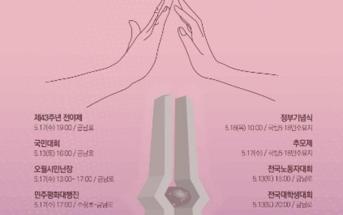 제43주년 5‧18민주화운동 기념행사가 시민, 대학생, 세계민주주의·인권운동가들이 대거 참여한 가운데 다채롭게 펼쳐진다.62개 참가단체로 구성된 ‘제43주년 5·18민중항쟁기념행사위원회’(이하 행사위)는 지난 3월 시민 공모를 통해 ‘오월의 정신을, 오늘의 정의로!’를