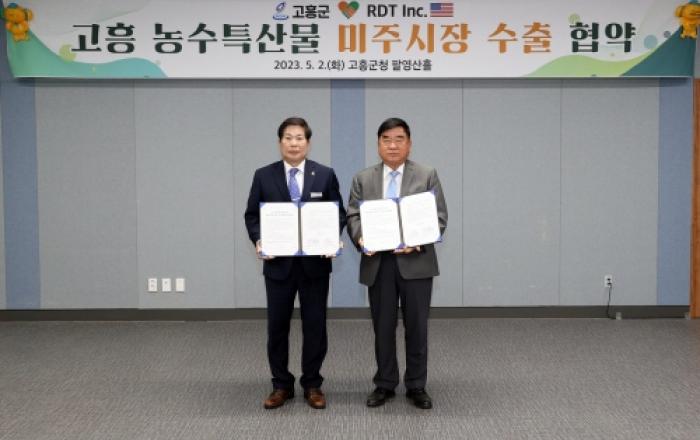 전남 고흥군은 지난 5월 2일 군청 팔영산홀에서 미국 현지 농수산식품 무역회사인 RDT Inc.와 고흥 농수특산물 5백만 불의 수출협약을 체결했다. 군에 따르면 이번 협약은 지난 4월 22일∼4월 23일, 5월 1일∼5월 4일 두 차례에 걸친 미주시장 현지바이어
