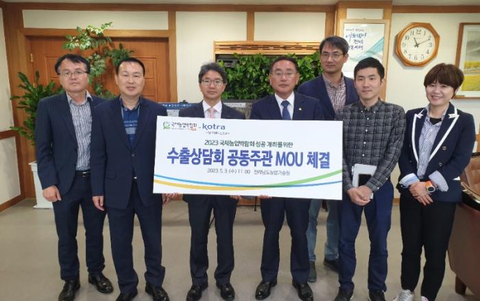 전라남도국제농업박람회 사무국은 국제농업박람회 수출 성과 창출을 위해 대한무역투자진흥공사(KOTRA)와 ‘2023 국제농업박람회 해외바이어 수출상담회’개최 업무협약을 했다고 밝혔다.협약식에는 박홍재 국제농업박람회 대표이사와 백인기 대한무역투자진흥공사 광주전남지원단장 등