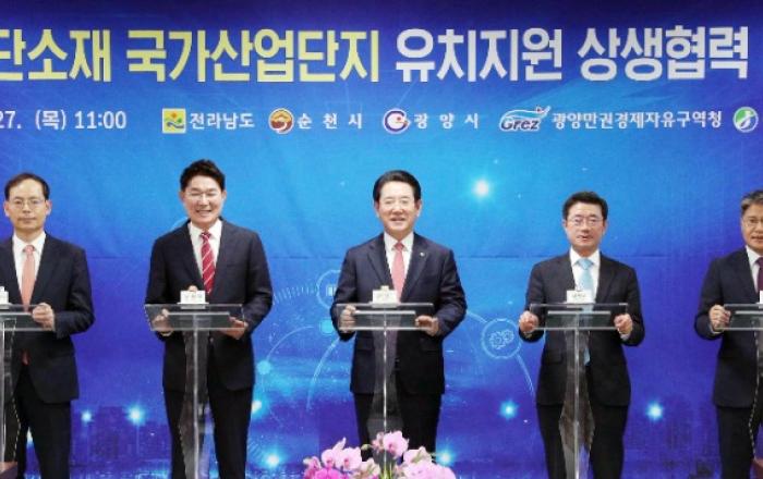 전라남도는 27일 광양만권경제자유구역청 회의실에서 순천시, 광양시와 이차전지, 수소, 기능성 화학 등 미래소재 산업 육성을 위한 ‘미래첨단소재 국가산업단지 지정 상생협력 업무협약’을 했다.협약식에는 김영록 전남도지사, 노관규 순천시장, 정인화 광양시장, 송상락 광양만권