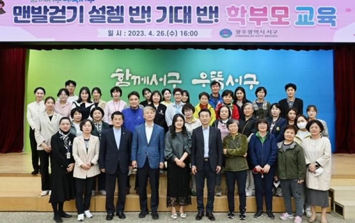 광주광역시 서구에서 '맨발걷기' 열풍이 불고 있다. 지난해 주민·직장동호회 중심으로 시작된 맨발걷기 붐이 어린이와 학부모 등 교육현장으로 확대되고 있다. 서구는 지난 26일 오후 서구청 들불홀에서 관내 어린이집, 유치원 학부모 및 학교 관계자를 대상으로 맨발걷기 교