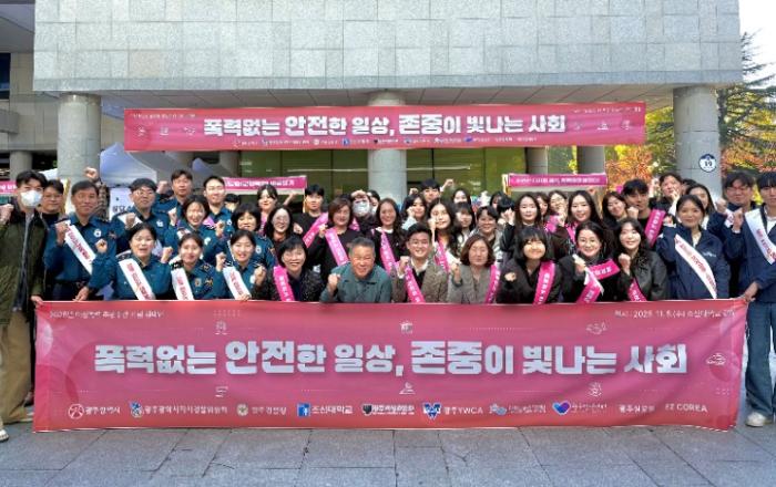 광주광역시(시장 강기정)는 ‘여성폭력 추방주간’(11월25일~12월1일)을 맞아 5일 조선대학교 중앙도서관 광장에서 ‘폭력 없는 안전한 일상, 존중이 빛나는 사회’를 주제로 합동 캠페인을 실시했다.※ 세계 여성폭력 추방의 날 : 유엔이 정한 공식 기념일로 11월25일이
