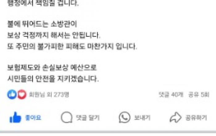 ‘불이 난 빌라에 들어가 주민을 구한 소방관에게 부숴진 현관문의 수리비를 물게 해야 하나’라는 논란에 강기정 광주시장이 “행정에서 책임진다. 소방관들은 걱정말고 시민 안전을 지키는 데 전력해 달라”고 당부했다.강기정 광주광역시장은 24일 사회관계망서비스(SNS)에 “불