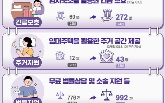 여성가족부는 교제폭력·스토킹 피해자의 특성을 고려한 상담, 주거지원, 치료회복 프로그램, 무료법률지원 등 맞춤형 사업을 추진하고 있다고 5일 밝혔다. 이에 피해자 보호를 위해 임시 주거지를 제공하는 긴급 주거지원은 2023년도 6개 시·도 시범사업 시행 후 지난해에 1