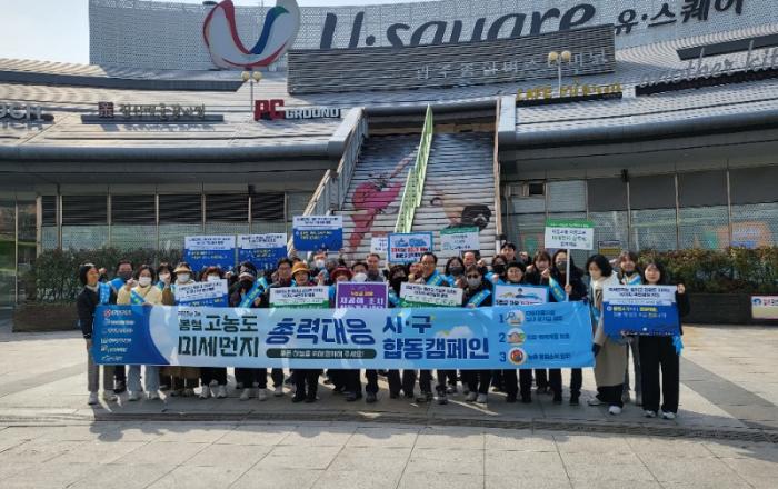 광주광역시(시장 강기정)는 7일 광주종합버스터미널에서 봄철 고농도 미세먼지 총력 대응을 위한 ‘시‧구 합동 캠페인’을 벌였다.이달까지 고농도 미세먼지의 잦은 발생이 예상된 가운데 미세먼지 대응요령을 홍보하고 미세먼지 저감을 위한 생활 속 실천 활동을 알리기 위해 마련됐
