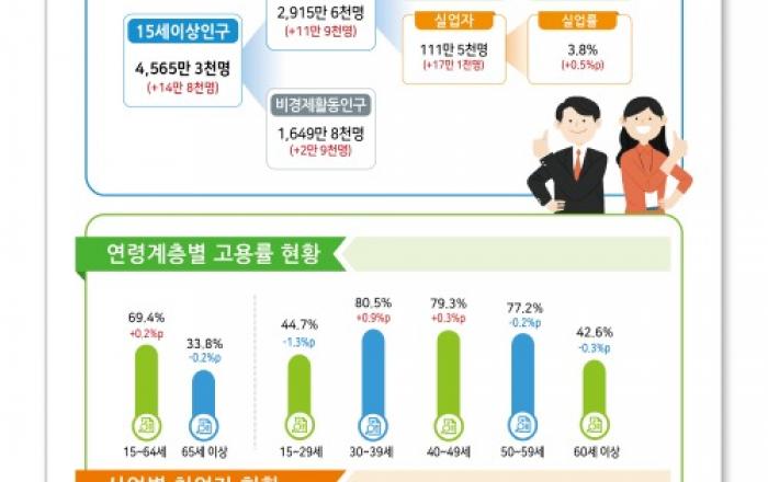 지난해 12월 15세 이상 고용률은 61.4%로, 전년대비 0.3%p 하락한 것으로 나타났다. 다만 15~64세 고용률은 69.4%로 전년대비 0.2%p 상승했고, 경활률은 63.9%로 전년대비 0.1%p 상승했으며 실업률도 3.8%로 전년대비 0.5%p 상승했다. 이
