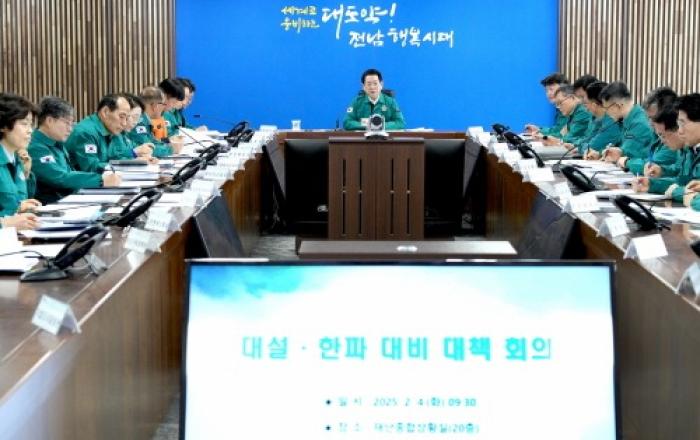 김영록 전라남도지사는 4일 오전 대설·한파 대비 대책회의를 열어 제설작업과 취약계층 한파 피해 등 상황을 살피고 도민 안전을 위한 분야별 신속한 대응을 지시했다.전남도에 따르면 4일 오전 8시30분 현재까지 장성 상무대 15.6cm, 함평 월야 10.5cm, 목포 연산