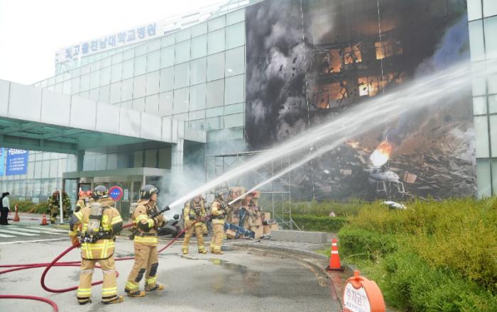 광주광역시 소방안전본부는 18일 오후 남구 빛고을전남대학교병원에서 대규모 복합재난 대응 합동훈련을 실시했다.이번 훈련은 헬기 추락, 병원 건물 화재와 붕괴, 산불 확산, 고압가스 탱크 폭발, 전기자동차 화재까지 이어지는 연쇄적 재난상황을 가정해 재난 현장에서 각 기관의