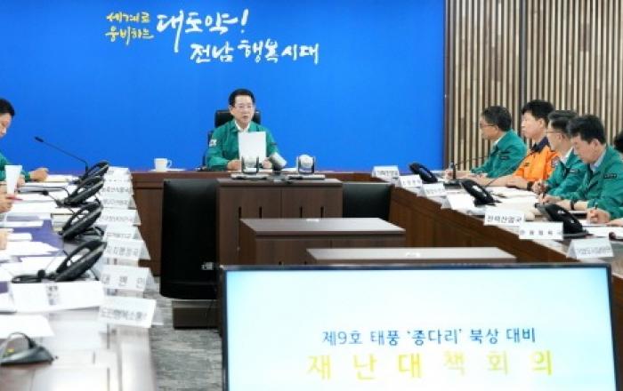 김영록 전라남도지사는 20일 재난종합상황실에서 실국장, 시군 부단체장 등과 함께 제9호 태풍 ‘종다리’ 북상 대비 재난대책회의를 열어 해수면 상승에 따른 해안가를 비롯한 취약시설 점검 등 선제적 대응을 지시했다.전남도에 따르면 제9호 태풍 ‘종다리’가 20일 새벽 제