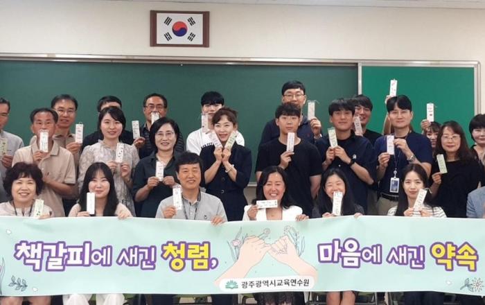 광주교육연수원은 지난 1일 전 직원이 참여한 가운데 ‘청렴 책갈피 만들기 행사’를 실시했다.이번 행사는 ‘청렴 릴레이 활동’의 하나로 전 직원이 함께 만들어가는 청렴한 조직문화를 조성하기 위해 마련했다.행사에서 직원들은 자율적으로 청렴에 대한 문구를 정하고 책갈피를 만