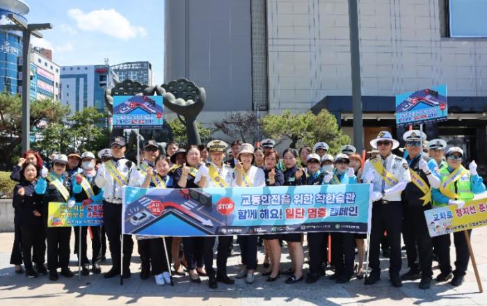 광주자치경찰위원회는 26일 서구 광천사거리에서 횡단보도 앞 교통사고 예방을 위해 민·관·언론 합동으로 ‘함께해요 일단멈춤’ 캠페인을 벌였다.이날 캠페인은 광주자치경찰위원회와 도로교통공단 TBN광주교통방송, 광주경찰청, 서부경찰서, 광주녹색어머니연합회, 광주모범운전자연합