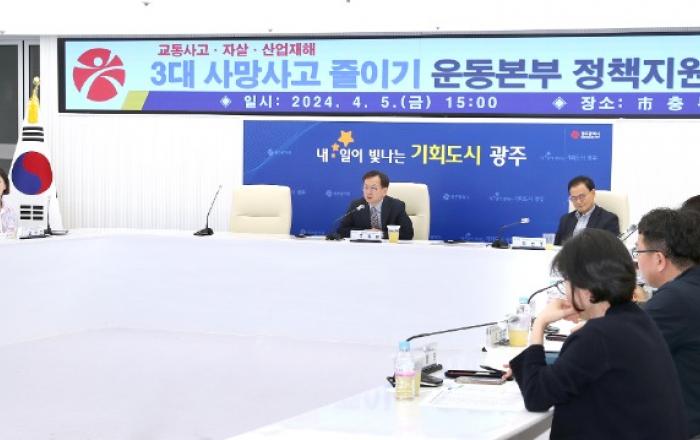 광주광역시(시장 강기정)는 5일 시청 충무시설에서 교통사고, 자살, 산업재해 사망사고 제로화를 위한 ‘3대 사망사고 줄이기 정책지원단 회의’를 개최했다.광주시는 지난해 5월 교통사고, 자살, 산업재해 3대 안전 취약 분야의 사망자 감축 목표를 설정하고, ‘3대 사망사고
