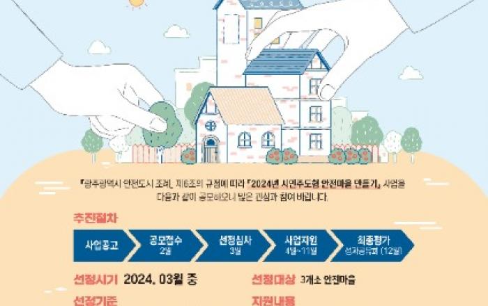 광주광역시(시장 강기정)는 ‘2024년도 시민주도형 안전마을 만들기 지원사업’에 참여할 주민협의체를 오는 26일부터 3월4일까지 공개모집한다.광주시가 지난해부터 추진하고 있는 ‘시민주도형 안전마을 만들기 사업’은 ‘언제 어디서나 안전도시 광주’ 실현을 위해 시민이 주체