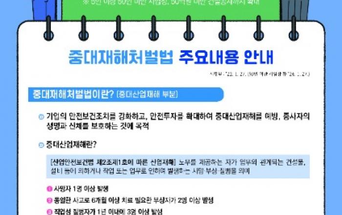 광주광역시(시장 강기정)는 27일부터 중대재해처벌 등에 관한 법률이 상시근로자 50인 미만 사업장(5~49인)까지 확대 시행됨에 따라 관계기관과 협업해 적극 대응한다.중대재해처벌법은 지난 2021년 공포(2021년1월26일 제정, 2022년1월27일 시행)되면서 50인