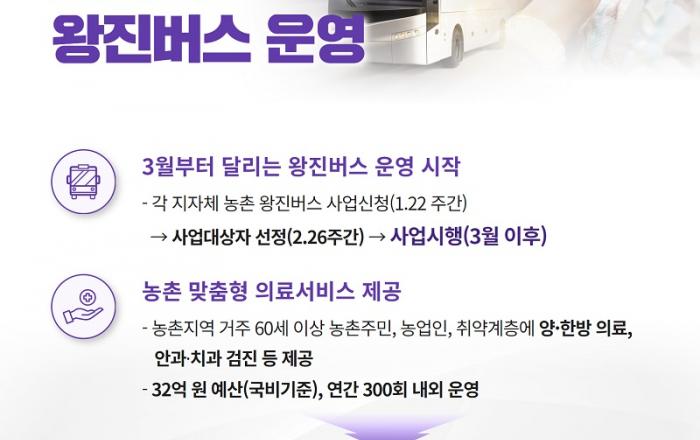 앞으로 의료 환경이 취약한 농촌 마을에 ‘왕진버스’가 찾아간다. 농림축산식품부는 오는 3월부터 의료가 취약한 농촌 지역에 의료접근성을 높일 수 있도록 농촌 왕진버스 사업을 도입한다고 18일 밝혔다. 농촌 왕진버스는 ‘국민과 함께하는 농촌’이라는 윤석열 정부 농정
