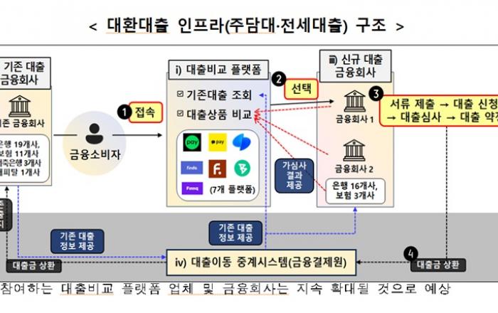 신용대출에 이어 아파트 주택담보대출(주담대)과 전세자금대출도 금융사를 방문하지 않고 스마트폰으로 쉽고 편리하게 갈아탈 수 있게 됐다. 금융위원회는 대환대출 인프라 이용 대상 대출 상품의 범위를 오는 9일부터 아파트 주택담보대출로 확대하고 31일부터는 전세대출까지 확대한