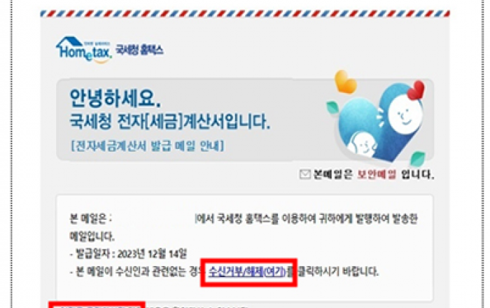 국세청은 부가가치세 신고와 연말정산 시기를 맞아 전자세금계산서 발급, 세무조사 출석요구 안내 등 국세청을 사칭한 다양한 악성 이메일과 문자메시지 등이 유포될 우려가 있어 각별한 주의가 필요하다고 당부했다. 최근 국세청을 사칭해 소득세 미납 안내라는 제목으로 개인명