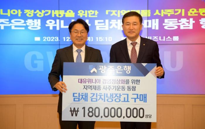 광주은행이 대유위니아 사태로 어려움을 겪는 지역협력업체 위기극복을 위해 팔을 걷어붙였다.광주광역시(시장 강기정)는 28일 오후 시청 비즈니스룸에서 위니아 딤채 구매 운동 동참행사를 열었다. 이날 행사에는 강기정 시장, 광주은행 고병일 은행장, 이상채 영업2본부 부행장,