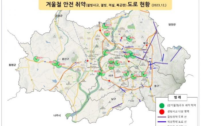 광주시가 겨울철 결빙된 도로로 인한 교통사고 등을 대비하기 위해 데이터 분석을 통해 안전 취약도로 18곳을 선정, 이를 시각화했다.광주광역시(시장 강기정)는 최근 5년간 동절기(12~3월) 공공·민간데이터 6종을 분석해 북구 양산동(한전 재무자재센터 부근) 등 겨울철