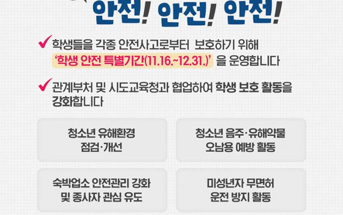 대학수학능력시험(이하 수능) 이후 학년말까지 학생 건강과 안전, 금융·경제 교육활동을 강화하는 다양한 프로그램이 마련된다. 또 각종 안전사고로부터 학생들을 보호하기 위해 이달 16일부터 다음 달 31일까지 학생 안전 특별기간이 운영된다. 교육부는 수능 이후 학년말 초·