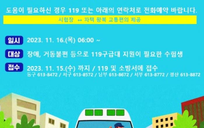 광주광역시소방안전본부는 오는 16일 실시하는 2024학년도 대학수학능력시험 수험생 편의를 지원하기 위해 ‘119이송 서비스’를 제공한다.119이송 서비스는 장애나 사고부상 등으로 거동이 불편한 수험생을 대상으로 전화 예약을 받아 시험 당일 119구급차로 자택에서 시험장