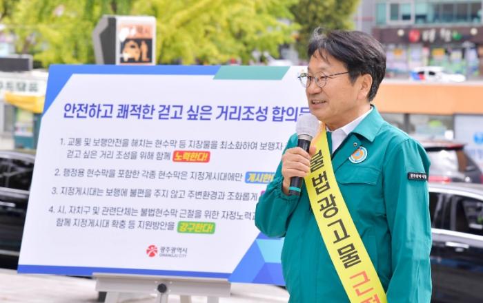 ▲강기정 광주광역시장이 13일 오후 북구 광주역 광장에서 열린 ‘깨끗한 거리 조성을 위한 현수막 정비 캠페인’에 참석해 인사말을 하고 있다./광주광역시 제공광주시가 교통 및 보행안전을 해치는 현수막 등을 최소화해 보행자 중심의 걷고 싶은 거리 조성에 앞장선다.광주광역시