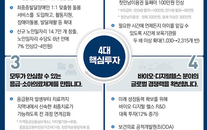 정부가 내년에는 ‘약자복지’를 더욱 두텁고 촘촘하게 강화하고자 복지 예산안을 올해 대비 12.2% 증가한 122조 4538억 원을 편성했다. 이는 2024년 정부 전체 총지출이 656조 9000억원으로 전년 대비 2.8% 증가율보다 3배 이상 큰 폭으로, 특히 정부 총
