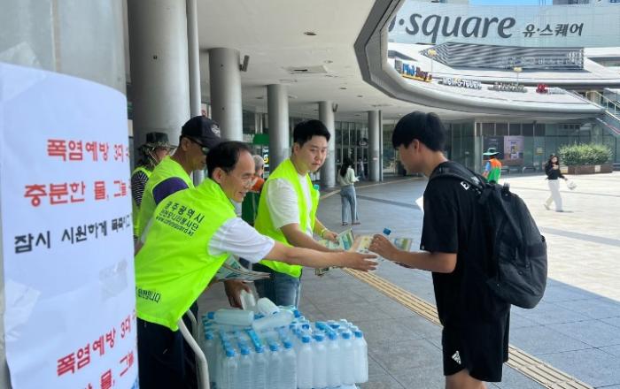 광주광역시(시장 강기정)는 6일 유스퀘어에서 여름철 온열질환을 예방하기 위한 ‘여름나기 물나눔 캠페인’을 전개했다.이번 캠페인은 폭염 대비 행동요령을 알려 온열질환 등에 대한 시민 경각심을 높이고 폭염 피해를 최소화하기 위해 마련됐다.캠페인은 지역자율방재단연합회와 광주