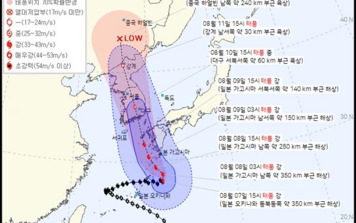 산림청은 태풍 ‘카눈’에 대비해 산사태 취약지와 산불피해지 등에 대하여 8.7.(월)부터 8.8.(화)까지 이틀간 집중점검을 실시하고 태풍의 영향권에서 벗어날 때까지 안전관리체계를 유지한다고 밝혔다 한반도 전역이 태풍 ‘카눈’의 영향권에