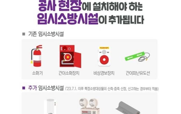 광주광역시소방안전본부는 오는 7월 1일부터 공사현장의 임시소방시설 설치기준이 기존 4종에서 7종으로 강화된다고 12일 밝혔다.지난해 12월 소방시설 설치 및 관리에 관한 법률이 개정됨에 따라 공사현장의 화재안전관리 강화를 위해 임시소방시설 설치 기준이 강화됐다.임시소방