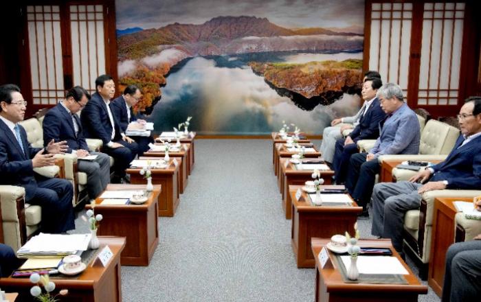 김영록 전남도지사와 ‘광주 전투비행장 무안 이전 반대 범군민대책위원회’(이하 범대위) 주요 간부들이 12일 전남도청에서 만남을 갖고 광주 민간공항과 군 공항의 무안국제공항 통합 이전에 대해 깊은 대화의 시간을 가졌다.이날 만남에는 범대위측의 박문재 상임공동위원장, 박일