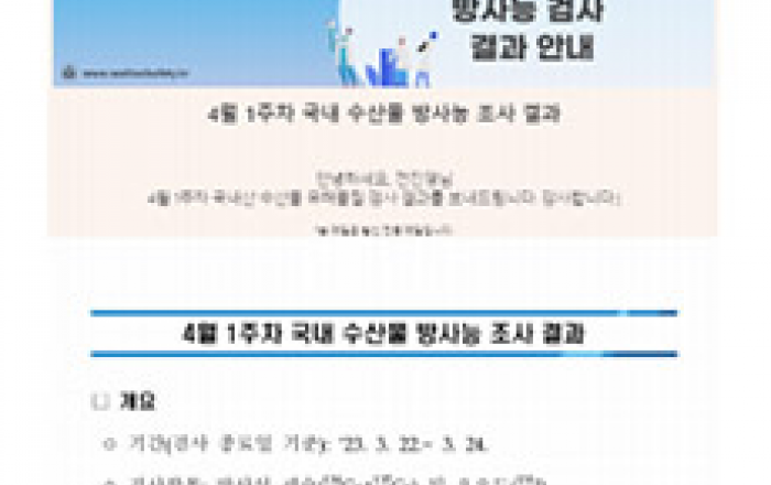 수산업계 종사자 외에도 우리나라 국민이라면 누구나 수산물 방사능 검사 결과 메일 발송 서비스를 신청해 금요일마다 받아 볼 수 있게 된다. 해양수산부는 오는 4일부터 ‘수산물 방사능 검사 결과 메일 발송 서비스’를 운영한다고 3일 밝혔다. 최근 일본의 후쿠시마 오염