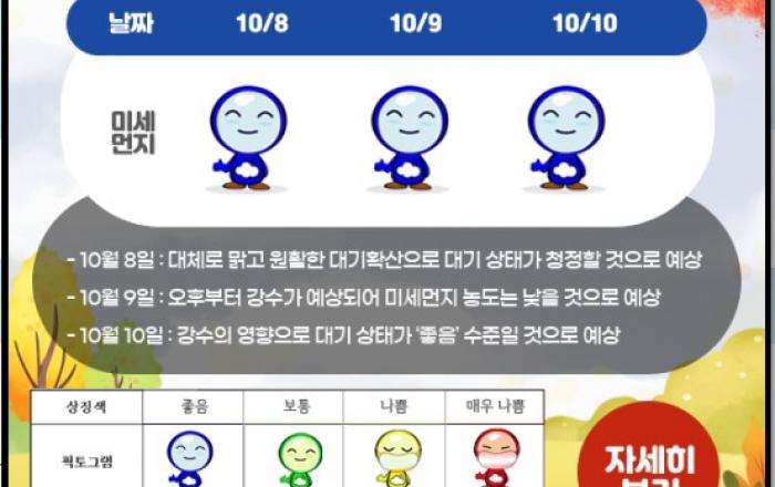 충북보건환경연구원은 2023년 5월 연휴 기간(5월 5일 ~ 5월 7일, 5월 27일 ~ 5월 29일) 미세먼지 예보를 충북보건환경연구원 누리집을 통해 사전 제공한다고 밝혔다. 사전 제공되는 미세먼지 예보자료에는 충북 권역별로 시계열 및 공간분포 변화, 기류 역궤적