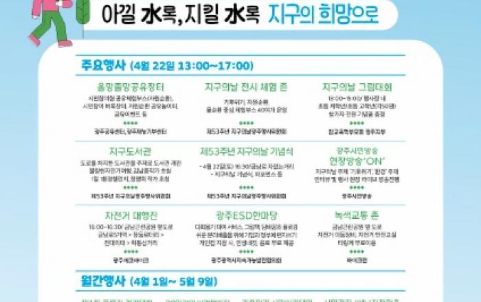 광주광역시(시장 강기정)는 22일 ‘제53주년 지구의 날’을 맞아 21일부터 27일까지 기후변화주간을 운영한다.기후변화주간에는 지구의 날 기념식, 소등행사, 사회관계망 이벤트 등 다양한 홍보 캠페인을 실시해 지구의 소중함과 탄소중립 실천의 필요성을 알리도록 할 계획이다