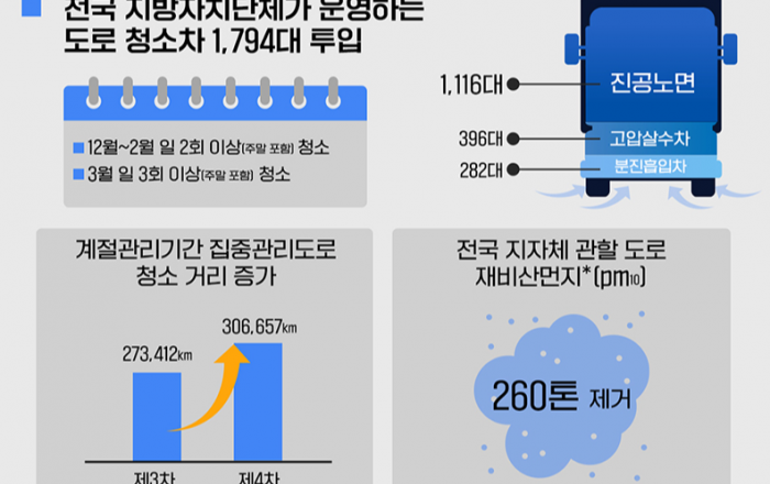 495개 집중관리도로 청소 전후에 미세먼지를 측정한 결과 평균 43.7% 감소한 것으로 나타났다. 환경부와 한국환경공단은 지난해 12월부터 올해 3월까지 제4차 미세먼지 계절관리제 기간을 실시, 이 기간동안 495개 집중관리도로를 청소했다. 이후 자동차 배출가스 등에