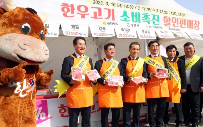 김영록 전라남도지사는 10일 제22회 광양매화축제 현장에서 추진 중인 한우고기 소비 촉진 행사에 참여, 소비심리 위축 등으로 어려운 한우농가 돕기에 직접 나섰다.이날 행사는 김영록 지사, 정인화 광양시장, 지역 축협장, 한우협회, 한우농가 등이 참여해 전남산 명품 한우