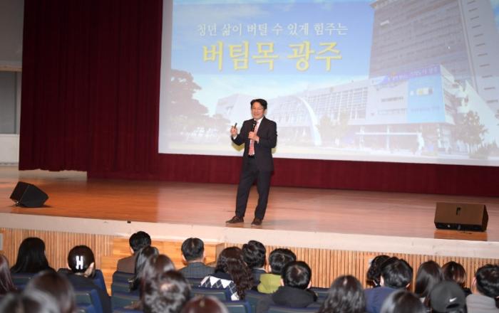 강기정 광주광역시장이 2일 2023년 상반기 광주청년 일경험드림플러스 사업에 참여한 13기 드림청년 480여명을 만나 응원했다.강 시장은 시청 대회의실에서 열린 일경험드림플러스 사업 공통교육에 참석, 특강을 하고 청년들의 고민을 함께 나눴다.강 시장은 먼저 “여러분과