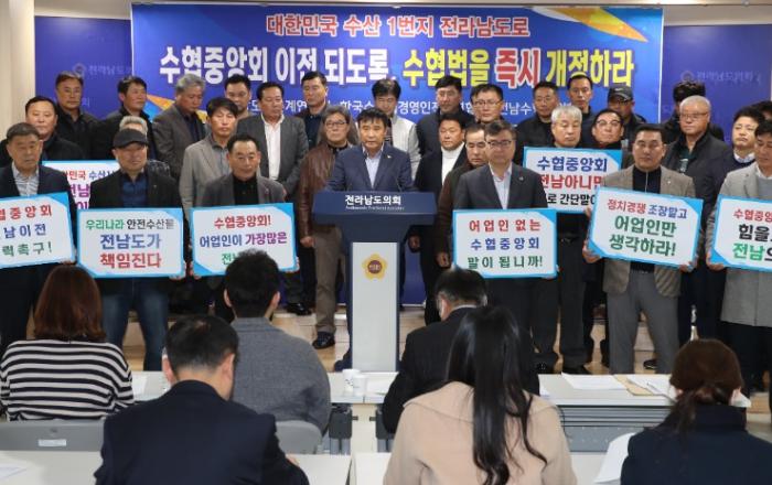 전라남도는 13일 전남도의회 브리핑룸에서 전라남도어촌계협의회, (사)한국수산업경영인전라남도연합회, 전라남도수협협의회가 기자회견을 열고 수협중앙회 전남 이전을 촉구했다고 밝혔다.기자회견에는 엄절용 전라남도어촌계협의회장, 박연환 (사)한국수산업경영인전라남도연합회장 등 40