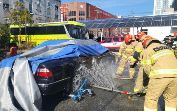 광주광역시 소방안전본부는 8일 119특수구조단 청사에서 전기자동차 사고 대응 인명구조 훈련을 실시했다.시 소방안전본부에 따르면, 최근 4년(2019~2022.11월) 동안 광주지역 전기차 화재는 총 6건으로 2019년 1건, 2020년 1건, 2021년 2건, 2022