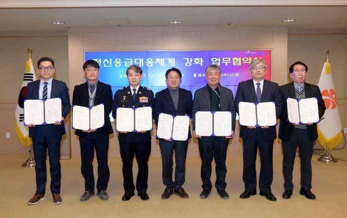 ▲ 강기정 광주광역시장이 12일 오전 시청 비즈니스룸에서 정신응급대응체계 강화를 위한 유관기관간 업무협약을 체결한 후 기념촬영을 하고 있다.(사진 왼쪽부터 강승범 보은병원장, 김상대 광주시립정신병원장, 임용환 광주경찰청장, 강기정 광주광역시장, 윤보현 국립나주병원장,