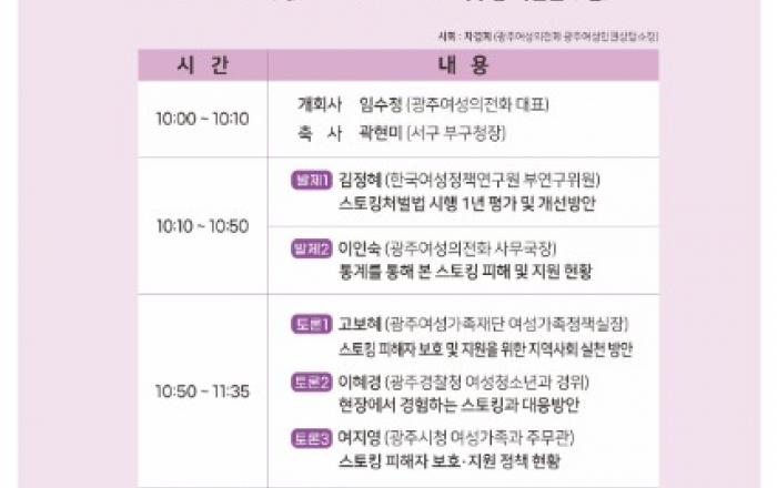 광주광역시(시장 강기정)와 (사)광주여성의전화는 2022년 세계여성폭력 추방주간(11월25일~12월1일)을 맞아 기념행사를 개최한다.먼저, 25일에는 전남대학교 도서관 별관 앞에서 시민들을 대상으로 ‘데이트폭력, 스토킹 등 신종 젠더폭력 바로알기’ 캠페인을 열고 ▲데이