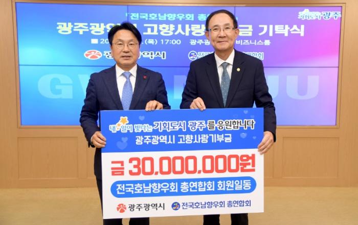 광주광역시(시장 강기정)는 31일 시청 비즈니스룸에서 ‘전국호남향우회총연합회 고향사랑기부금 기탁식’을 개최했다.이날 기탁식에는 강기정 시장을 비롯해 최순모 전국호남향우회총회장, 양승권 대구경북호남향우회장, 오명석 인천호남향우회장, 이성구 울산호남향우회장, 박순자 부산호