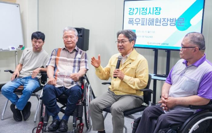 강기정 광주광역시장은 11일 최근 집중호우로 피해를 입은 광주시립장애인복지관을 찾아 피해현장을 점검하고 복지관 이용자들의 애로사항을 청취했다.광주시립복지관은 최근 호우로 체육관동 외벽을 통해 빗물이 유입돼 침수피해를 입었다. 지난달 폭우 때도 복지관동 및 보호작업장에