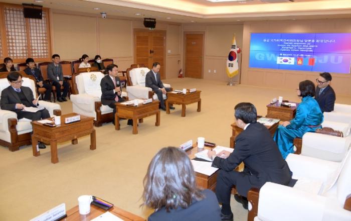강기정 광주광역시장은 23일 시청 비즈니스룸에서 몽골 살당 오덩토야 국가회복관리위원장(국회부의장)을 만나 광주와 몽골 간의 민주·인권·평화 협력 확대 방안을 논의했다.이날 접견에서는 강 시장과 몽골 살당 오덩토야 국가회복관리위원장은 1980년 5·18민주화운동과 몽골의