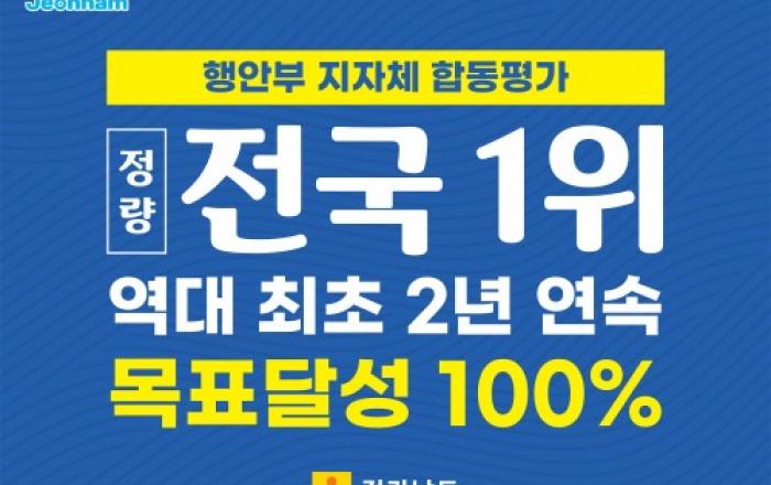 전라남도는 행정안전부의 2025년(2024년 실적) 지자체 합동평가 결과 정량지표에서 2년 연속 100%로 1위를 달성했다고 밝혔다.이는 지난해에 이어 전국 17개 시·도 가운데 유일하게 정량지표 100% 달성한 것이다. 2년 연속 100%는 앞으로도 깨지기 어려울 것