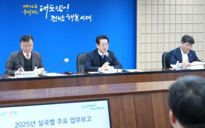 김영록 전라남도지사는 15일 도청 서재필실에서 새해 업무보고회를 열어 “올해는 국가적 아픔을 치유하고 새 희망을 향해 전진해야 하는 중요한 해”라며 “전남 발전과 도민 행복에 최선을 다해야 한다”고 강조했다.보고회에선 2025년 주요 현안과 역점시책을 중심으로 전남 발