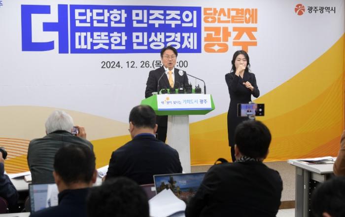 강기정 광주광역시장은 26일 “2024년은 ‘어제의 광주가 오늘의 대한민국을 지켜낸 해’였다”며 “이제 ‘오늘의 광주가 내일의 대한민국을 더 단단하게’ 만들겠다”고 밝혔다.강기정 시장은 이날 시청 브리핑룸에서 ‘송·신년 기자회견’을 열어 ‘광주시 2024년 시정 성과와