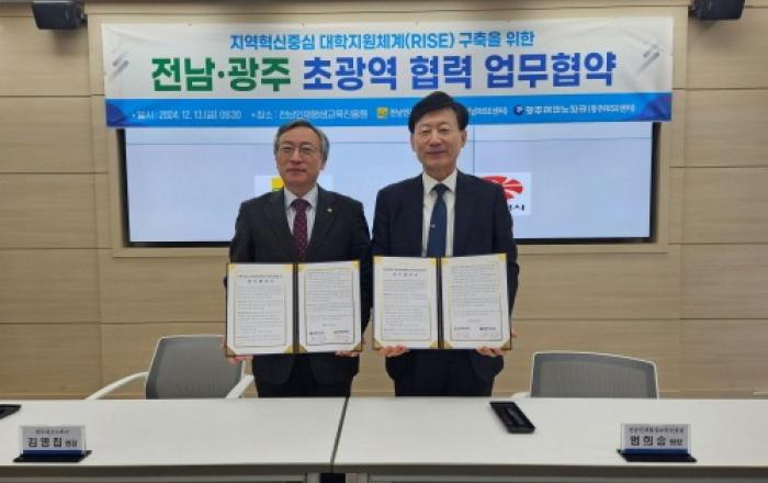 전라남도인재평생교육진흥원은 13일 인평원에서 2025년 지역혁신중심 대학지원체계(RISE) 사업의 성공적 추진을 위해 광주테크노파크와 전국 최초 초광역 협력체계 구축 업무협약을 했다.협약식에는 범희승 원장, 김영집 원장, 손영곤 전남 RISE센터장, 김보현 광주RISE