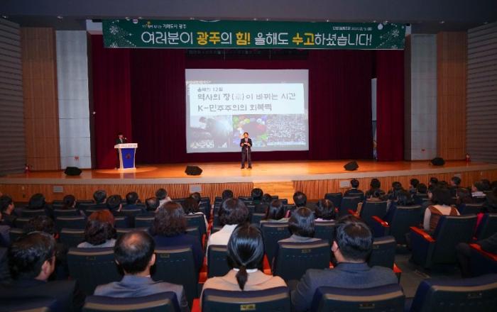 강기정 광주광역시장은 16일 시청 대회의실에서 올해 마지막 정례조회를 열고 “한 해 동안 누구보다 열심히 뛰어준 공직자들이 ‘광주의 힘’”이라며 직원들을 격려했다.강 시장은 이날 공직자들과 ‘광주를 빛낸 스타정책 베스트10’ 등 올 한 해 광주시의 노력과 성과를 돌아보