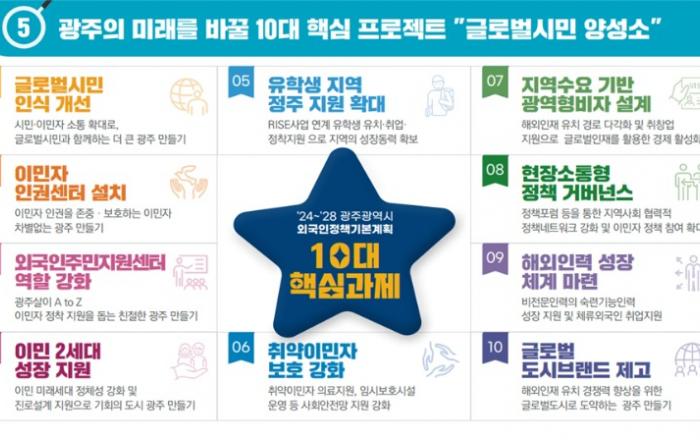 광주시가 외국인 유입과 정착 지원 등 구체적 실행방안을 담은 ‘외국인정책 기본계획’을 수립했다.광주광역시(시장 강기정)는 17일 시청 행복회의실에서 광주시 외국인주민정책위원회를 열어 ‘제1차 광주시 외국인정책 기본계획(2024~2028)’에 대해 심의, 확정했다.광주시